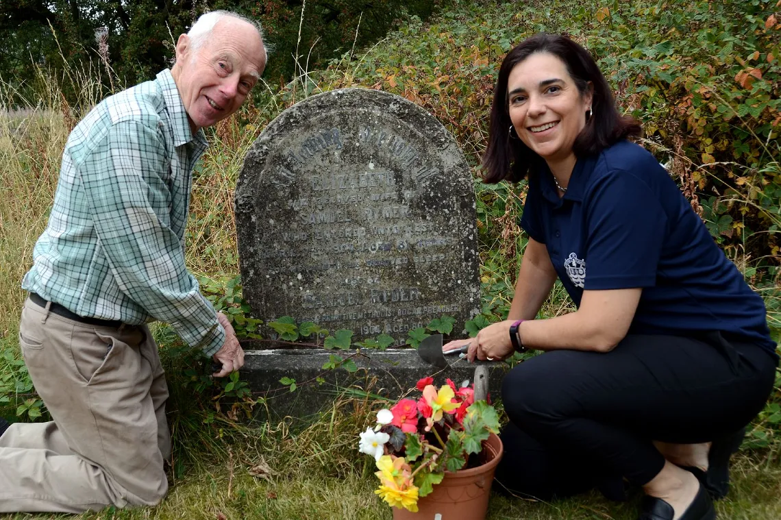 Armed with trowel and pruners to attack the brambles, Ken and office manager Jessica Barlow set to work to restore the grave.